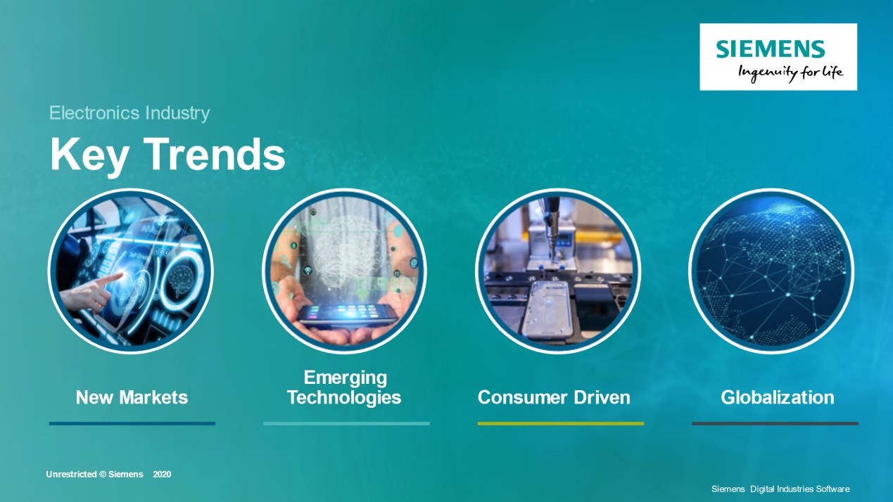 在过去,西门子一直致力于更好地服务全球客户,与客户共同成长。在与全球顶尖电子公司持续探讨与深度合作过程中,西门子对于电子行业的发展趋势、市场机遇及挑战,获得部分共识: